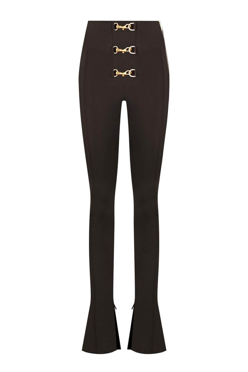 Açıklama: Metal gold aksesuar detaylı yandan açılır fermuarlı. Paça gizli fermuarlı yırtmaçlı licralı Flare paça Leggins