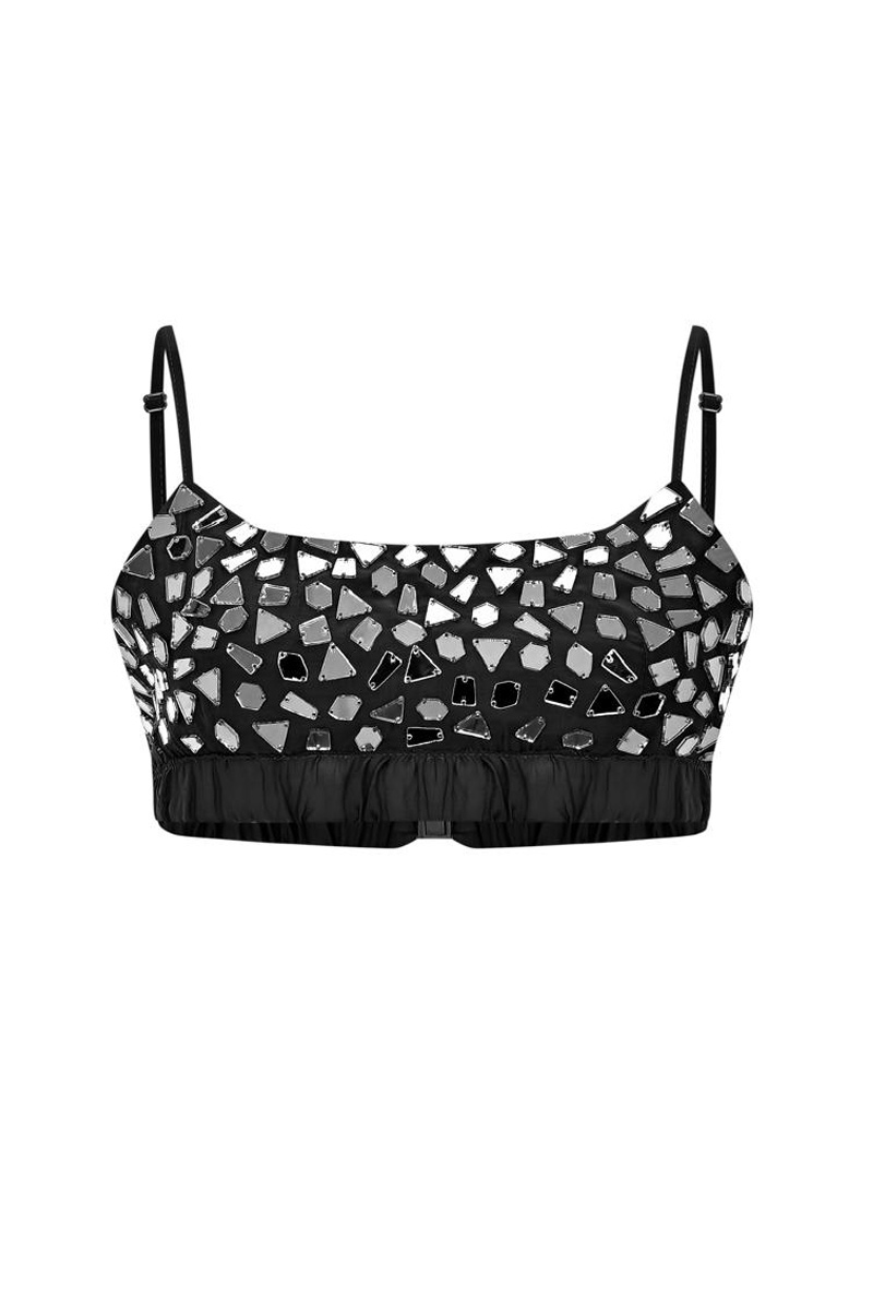 Açıklama : Önden düğmeli bol kesim gömlek ve silver aksesuar işlemeli arkadan açılır metal tokalı crop top takım
