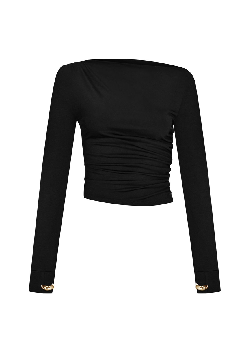 Açıklama : Tek omuzu düşük büzgülü kol ucu parmak gold yüzük detaylı top
